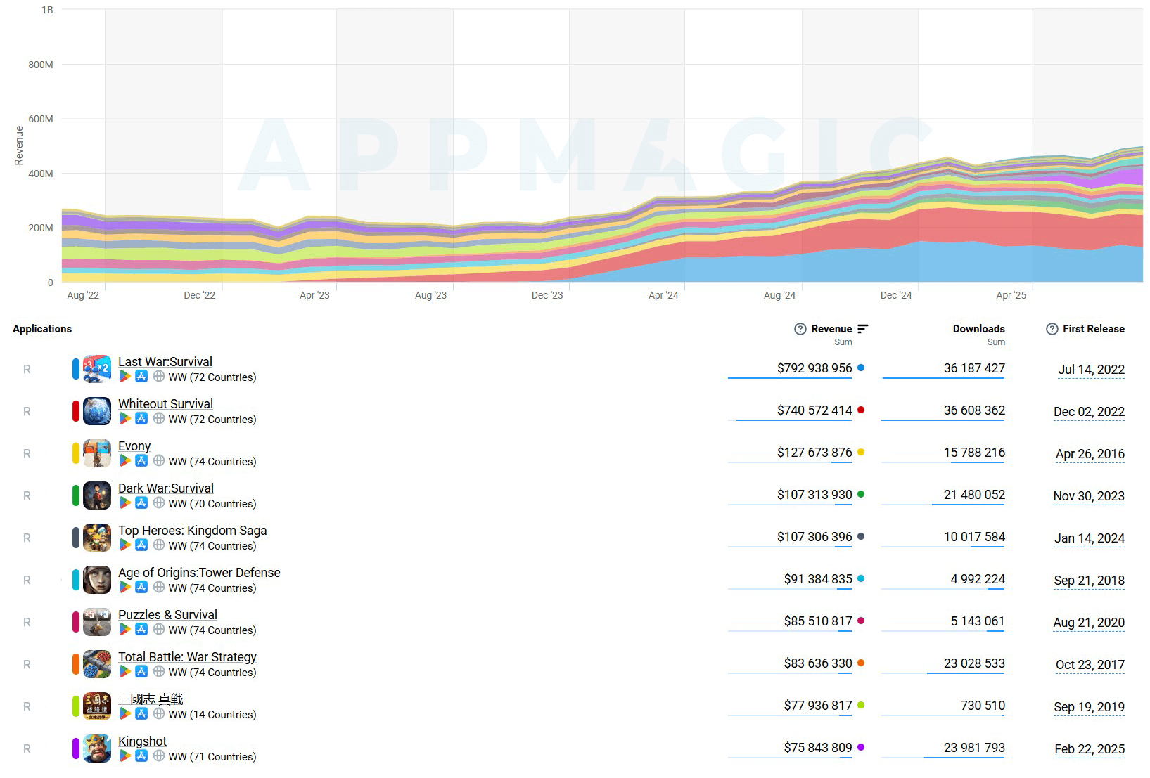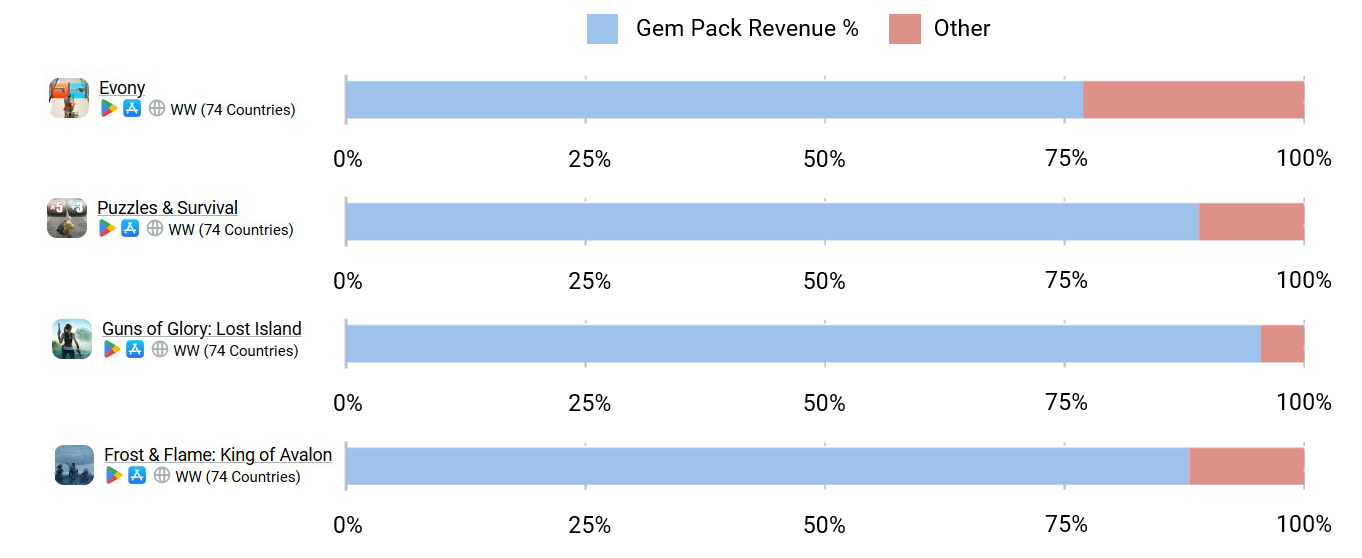 To understand if these aspects notably influence overall performance, we’ll take a few top titles that approach their monetization differently and compare their data side by side. For this research, we picked Evony, Puzzles & Survival, Rise of Kingdoms, Kingshot, Frost & Flame: King of Avalon, and Guns of Glory: Lost Island.