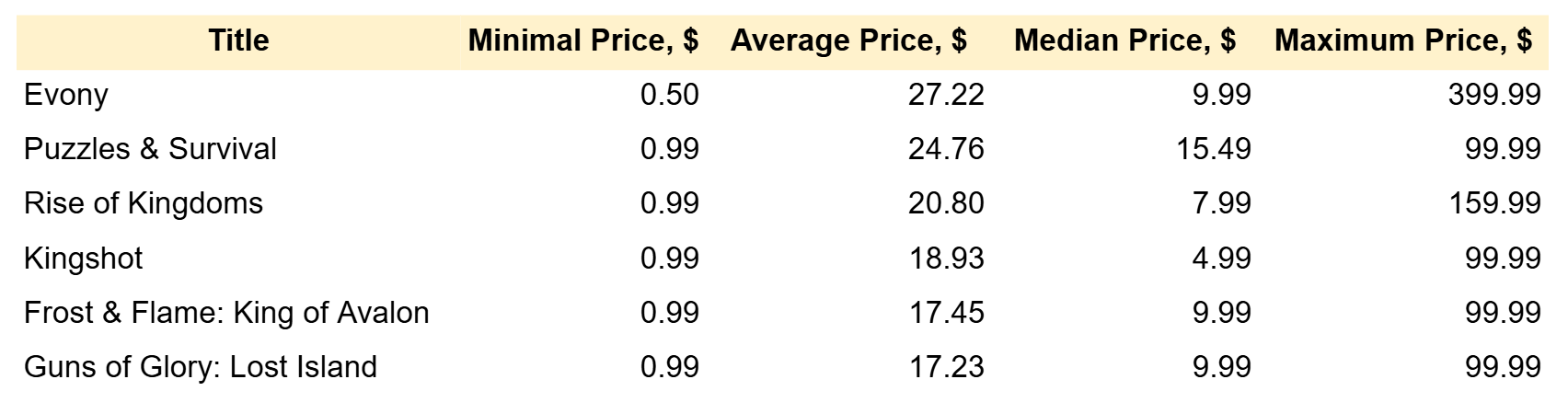 Looking at pricing strategies, many monetization elements in these titles overlap. For example, the median price of IAP offers often falls within the $7.99–$9.99 range across the genre, which provides a general understanding of the average paying user profile. Yet clear exceptions stand out, such as Kingshot coming in with the lowest median price, while Evony pushes the ceiling with the highest maximum price.