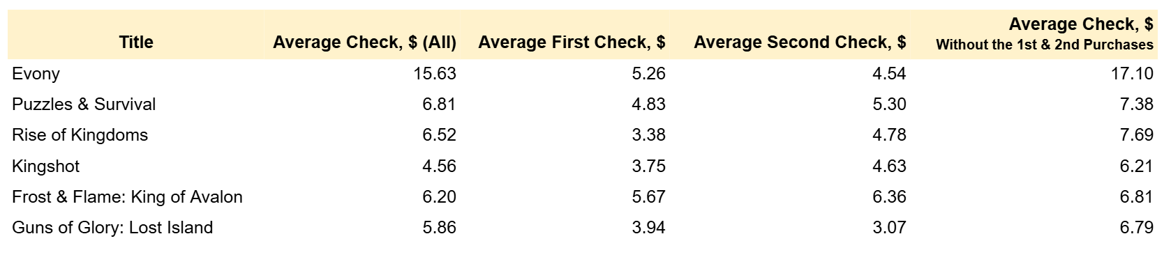 The specifics of monetization strategy and pricing can also be observed in user payment behavior at the early stages of in-game activity. The average check for first-time payments in some titles—like Rise of Kingdoms and Kingshot—is lower than for the subsequent purchases, while Evony, by contrast, aggressively monetizes users right from the start.