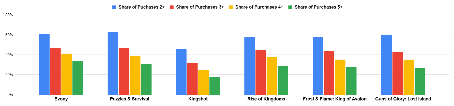 Even with noticeable gaps in pricing and early monetization tactics, conversion into repeat spend remains largely consistent across the leading titles. Kingshot stands out, but this pattern likely reflects the nature of its traffic: the game actively experiments with creatives and may be bringing in a broader but less targeted audience.