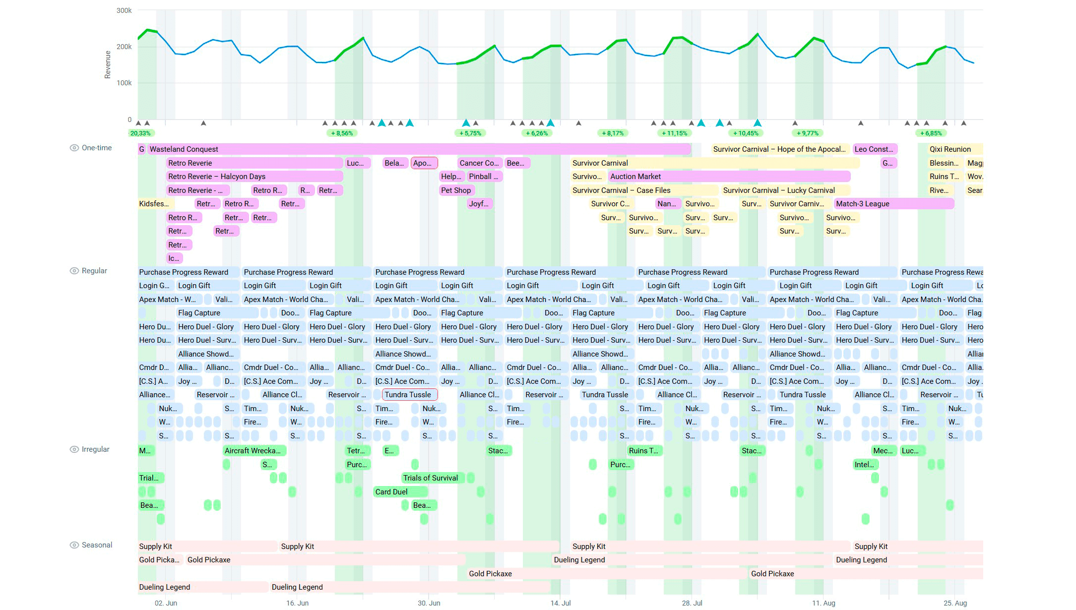 These monetization layers are often supported by an accordingly rich and well-structured LiveOps calendar. Take a look at the Puzzles & Survival’s event calendar as an example: you won’t find a single gap! A dense mix of regular events—up to 15 running all at once—is complemented by seasonal milestones and various irregular and one-time events. This intense blend of events is designed not just to sustain retention, but also to convert it into revenue.