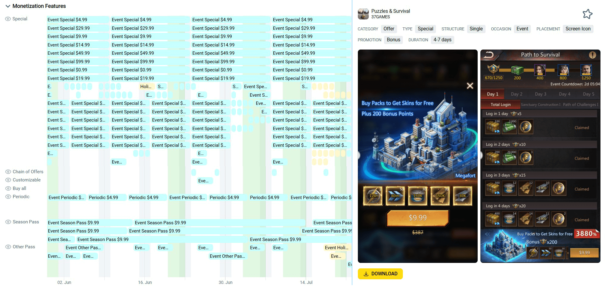 Yes, each monetized activity has its own progress bar and rewards. However, spending or progressing in one often feeds into another, multiplying the incentive to engage. Puzzles & Survival executes this method by layering a large number of special offers (with multiple price options to cover different segments) with seasonal passes, customizable bundles, and periodic offers.