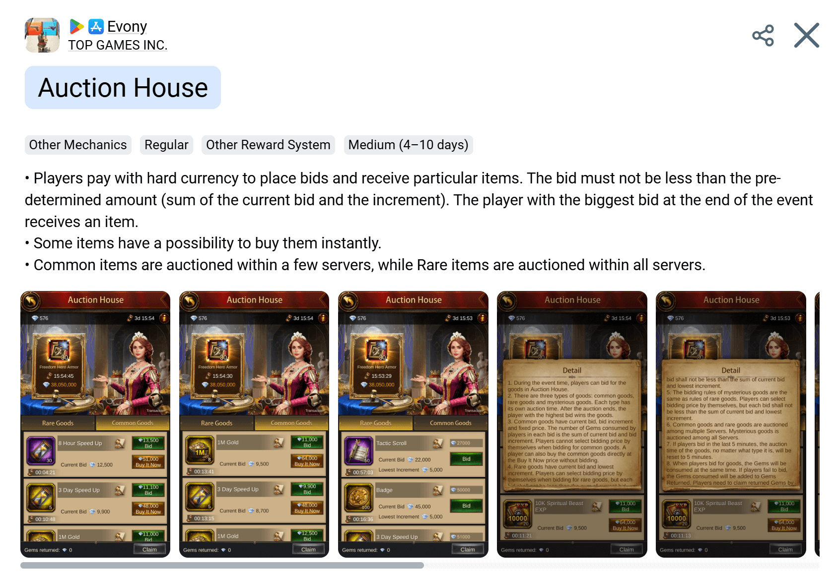 Friction is built into the structure: single-build limits, long march times, restricted exploration. The paid workaround is never far from view. Some titles add financial meta-systems such as auction houses, gem banks, or gacha to create deep, ongoing spend sinks. Evony, for instance, uses Auction House to provide an additional layer of hard currency spend.