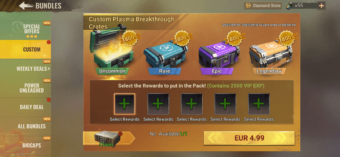 In 4X games, they’re especially effective for advanced players who know exactly which bottlenecks they want to solve. They also double as a monetization “safety net”: should the player not be tempted by a themed event pack, a customizable bundle might just entice them. A good example of this simple trick is the “Exclusive Custom Bundle” in State of Survival, which provides a clear visualization of available slots to populate the offer and to encourage players to tailor their own pack of rewards.