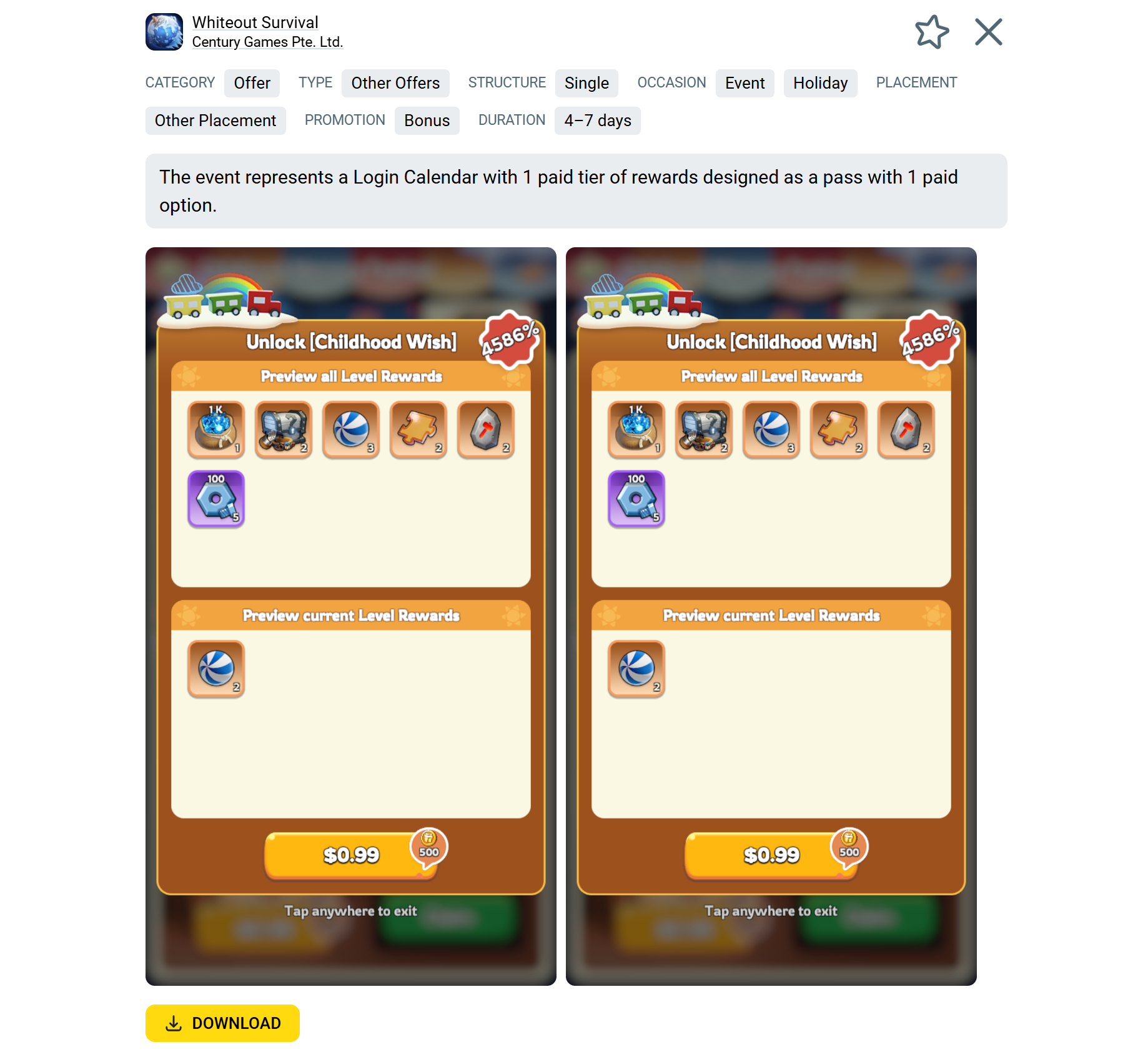 Offers are more likely to appear at the completion of a major upgrade, building on the sense of progression and flow. For example, State of Survival strategically places the time-limited Hero Offer on day 7—after some significant progression is achieved—rather than rushing it. Timing is crucial, and the goal is to ensure players are engaged enough before converting them. The first offers are often relatively cheap, serving as a low-risk introduction before players encounter more substantial monetization steps.