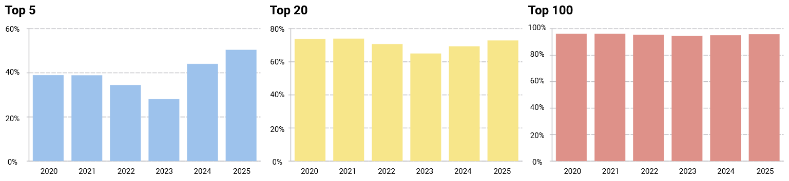 Long-standing market leaders continue to hold their ground year after year, making it harder for newcomers to break through—especially for western developers, as only 25% of their projects make it to the top 100.