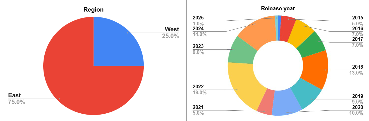 H1 2025 top 100 grossing 4X Strategy Titles: distribution by region and release year