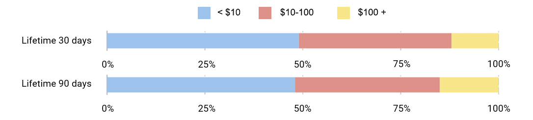 At this pace, segmenting players by their spending potential within the first 30 days is critical. For example, on average, only 3% of users move from the “paid up to $100” segment to the “paid over $100” segment between day 30 and day 90. The vast majority of high-spending users reach this threshold within the first 30 days, and the overall distribution remains largely unchanged afterward.