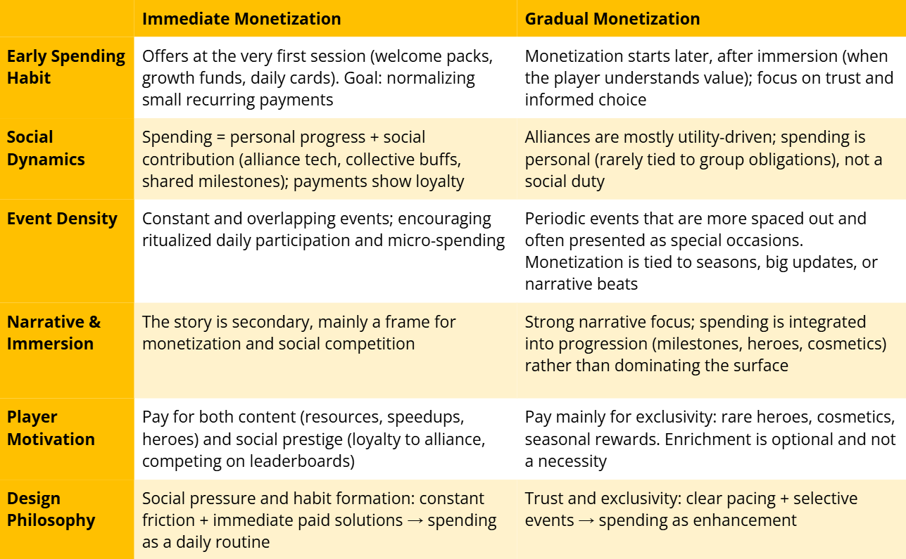 Looking across the full player lifecycle, it’s not only about UI density or timing. The contrast between these two monetization strategies often extends into underlying design philosophies that define how spending is positioned within the player’s experience: