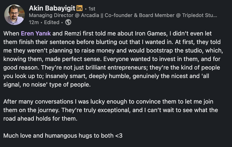 Babayigit praised the founders’ track record, calling them “disciplined, lean, and relentlessly focused on execution,” and expressed confidence that Iron Games could become one of the defining studios of the decade.