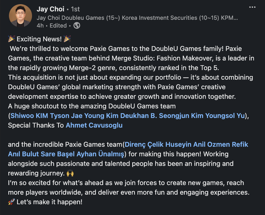 “This acquisition represents a transformative step for DoubleU Games as we expand into the fast-growing Merge-2 puzzle genre,” said Jay Choi, CFO of DoubleU Games. “Paxie Games brings a unique edge with its engaging gameplay, intuitive mechanics, and innovative LiveOps strategies, which have proven highly effective in retaining players and driving user engagement.”