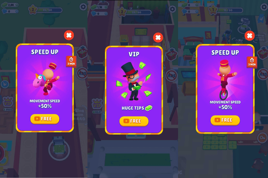 Ads are used tactically. You can watch one to double your earnings, unlock a feature early, or recover from a bottleneck. But what really makes them work is when they’re framed as boosters. Players want their park to look good. They want that next ride now. Ads help make that happen without grinding. That’s why this game ranks in the top 10% for ad engagement-to-time-spent ratio in idle games. It’s not that the game pushes more ads. It’s that players feel like ads actually give them something.