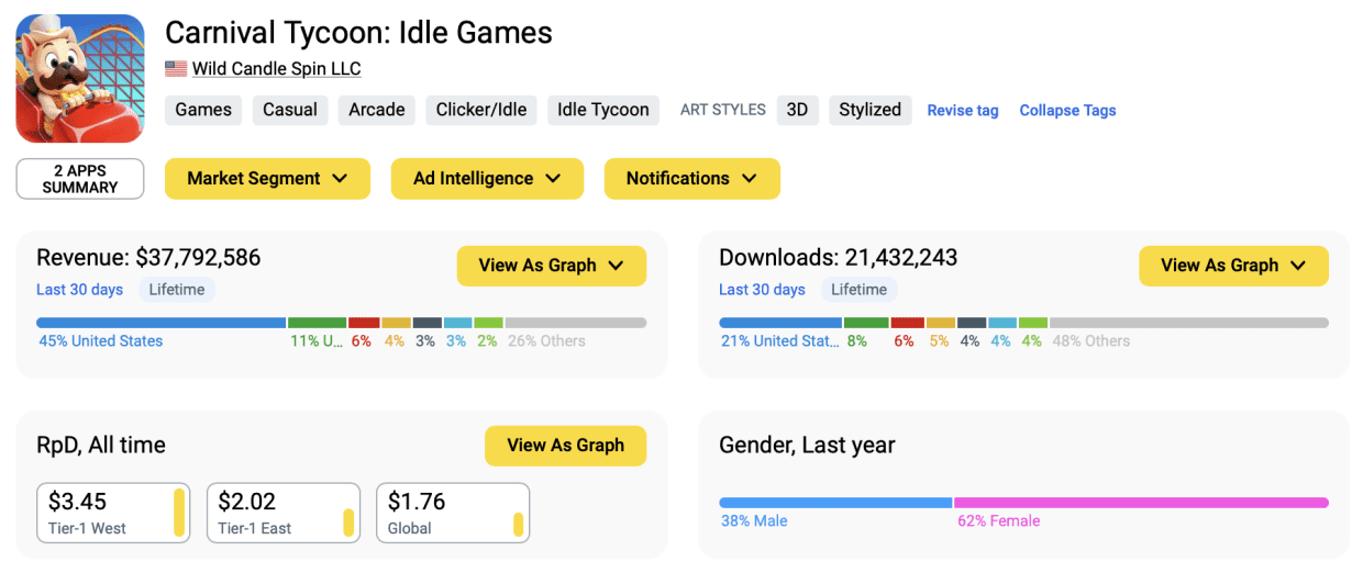 On the IAP side, monetization is driven mostly by cosmetic upgrades, themed bundles, and limited-time income boosters. The US ARPU is around 29 cents, which might not sound huge, but at this scale and with this many ad views, it adds up.