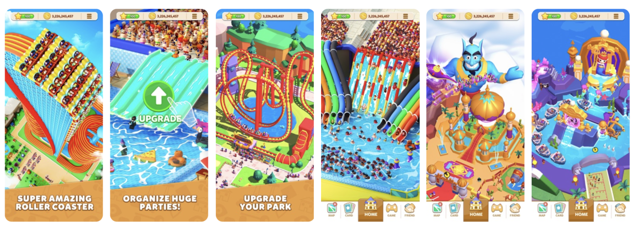 You’re building a theme park from scratch. You start with a basic ride and a ticket booth. Then you slowly add more attractions, food stands, cosmetic upgrades, and eventually new themed zones. The progression curve is long and steady. You don’t unlock everything in the first day. In fact, you’re not meant to. The game builds engagement by spacing out its biggest rewards.