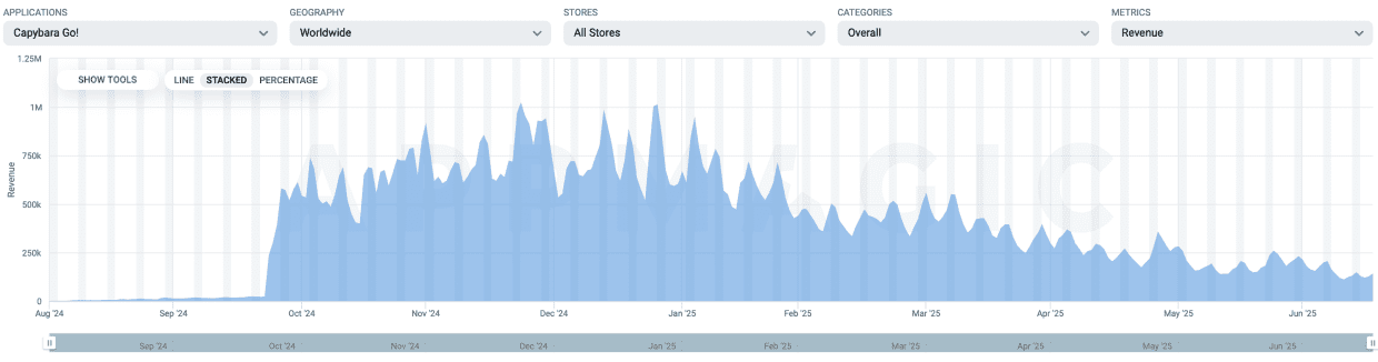 The game also makes sharing part of the loop. Players are encouraged to post screenshots, share their best-looking capybaras, and challenge friends. And it’s working. According to the latest data, 13% of all new installs are driven by share-based referrals. That’s unusually high in mobile gaming, especially for an idle-driven game.