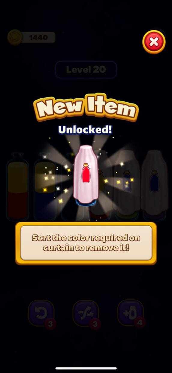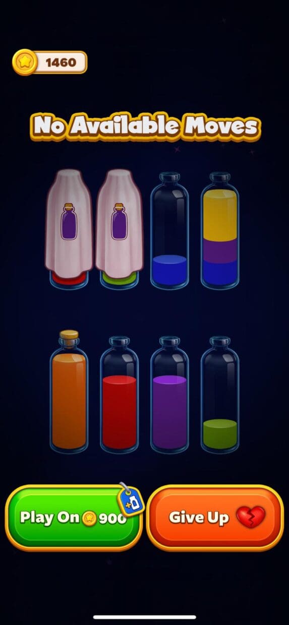 Most water-sorting puzzle games won’t tell you if you’ve bricked your level with an incorrect move. Some games, like Colorwood, add timers to levels, adding stress and urgency to the gameplay. But Magic Sort stands out by keeping the calmness of no timers and no move limits—a smart move that enhances the relaxing nature of the game.