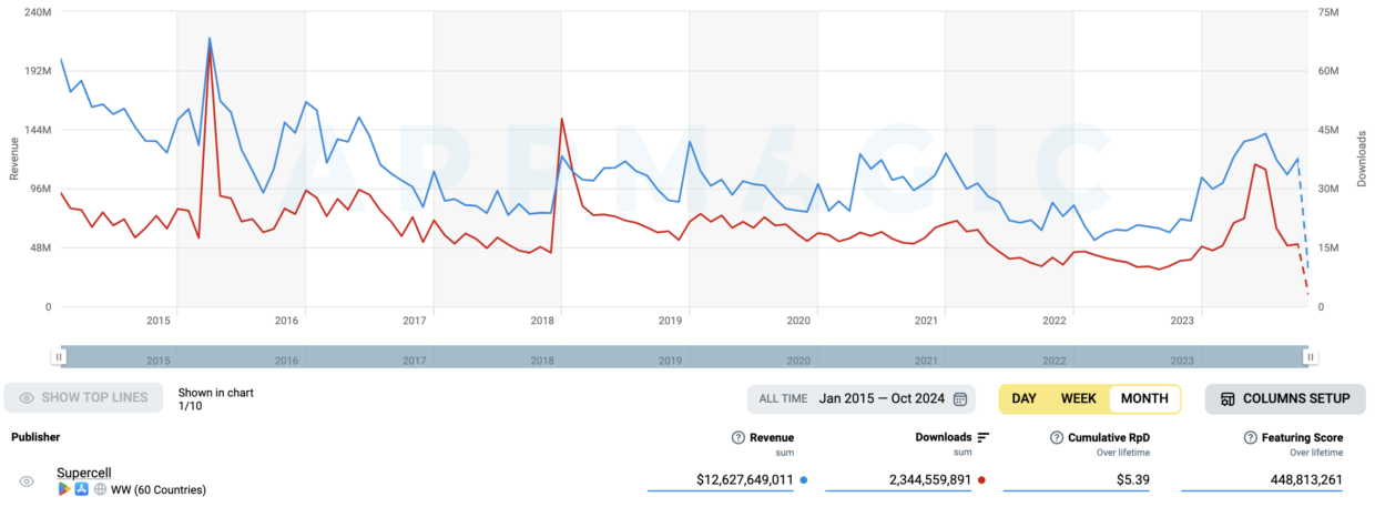 By late 2024, both downloads and revenue are dipping, signaling a need for fresh content or a new blockbuster game to revive momentum. Supercell’s focus now seems to be squeezing value from its loyal player base rather than chasing new growth.
