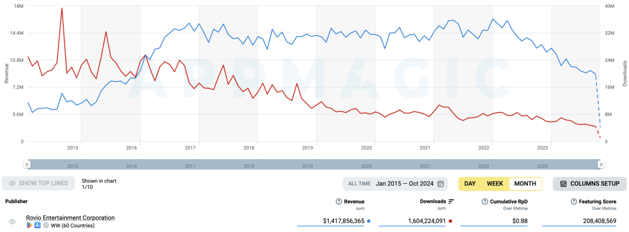 Rovio’s lifetime performance shows $1.4 billion in revenue & 1.6 billion downloads, but a steady decline in both metrics after peaking in 2018.