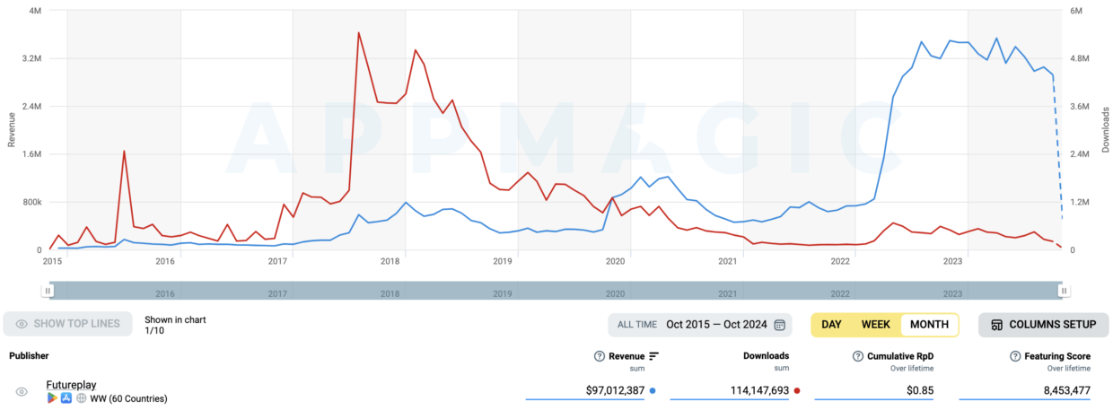 Since its launch, Futureplay has accumulated $97M in revenue and 114M downloads. They saw the peak in 2018, but both downloads and revenue have significantly declined since 2020, despite occasional spikes in 2021.