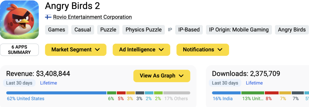 Angry Birds 2 has generated $3.4M in IAP Revenue & 2.4M Downloads over the last 30 days.