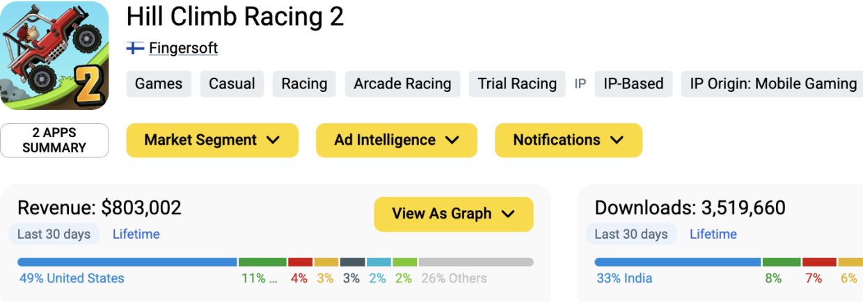 Recent monthly figures show Hill Climb Racing 2 generating $803K in IAP revenue and 3.5M downloads.