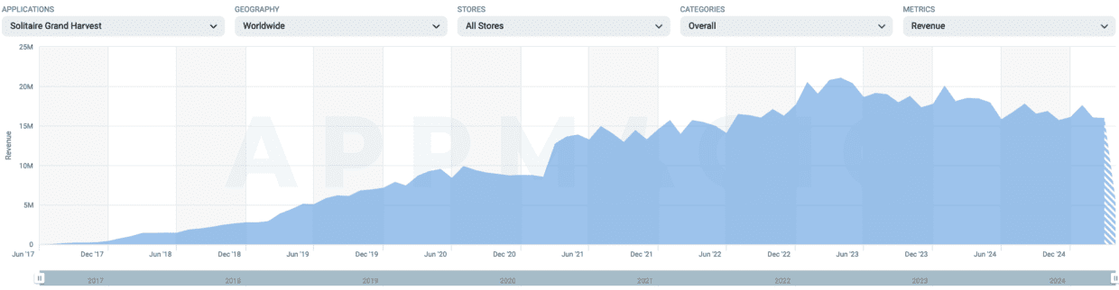 Solitaire Grand Harvest was developed by Supertreat and officially released in 2017. While it began with a modest following, its trajectory changed dramatically when Playtika acquired the game in 2019. From there, it grew—no, exploded—thanks to a powerful blend of smart live ops, polished monetization, and marketing that knew exactly how to target the casual mobile gamer.