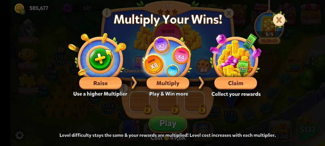 To keep things exciting, SGH lets you raise your bets by 2x, 4x, 8x up to 15x. It’s a clever risk-reward mechanism that appeals to both low-stakes grinders and high-rollers looking for big rewards. Of course, the house always wins eventually. Run out of coins? You’ll either wait for your hourly harvest or you’ll be nudged toward making a purchase.